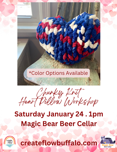 This event has ended. Sign up for updates on future events from the Botanical Gardens. Name(Required) First Last Email Question/Comment January 24, 1:00 pm - 3:00 pm Cost: $45 Location: Magic Bear Beer Cellar 799 Seneca St Suite B, Buffalo, NY 14210 Learn the basics of hand knitting as we walk you step by step through the process of creating your own hand knit heart pillow! Pillows are approximately 12″; chenille yarn- 100% polyester. Knitting level for this workshop is Intermediate. Previous knitting experience is helpful, but not required (ie. our blanket, pumpkin or scarf workshops) We will offer very guided step by step instructions. Register for the workshop here. Magic Bear Beer Cellar 799 Seneca St Suite B, Buffalo, NY 14210 (716) 844-8637 Website Casual bar and bottle shop featuring a wide beer selection, plus bar bites and educational tastings and classes. Presenting free Trivia on Thusdays. Open for Buffalo Bills games.