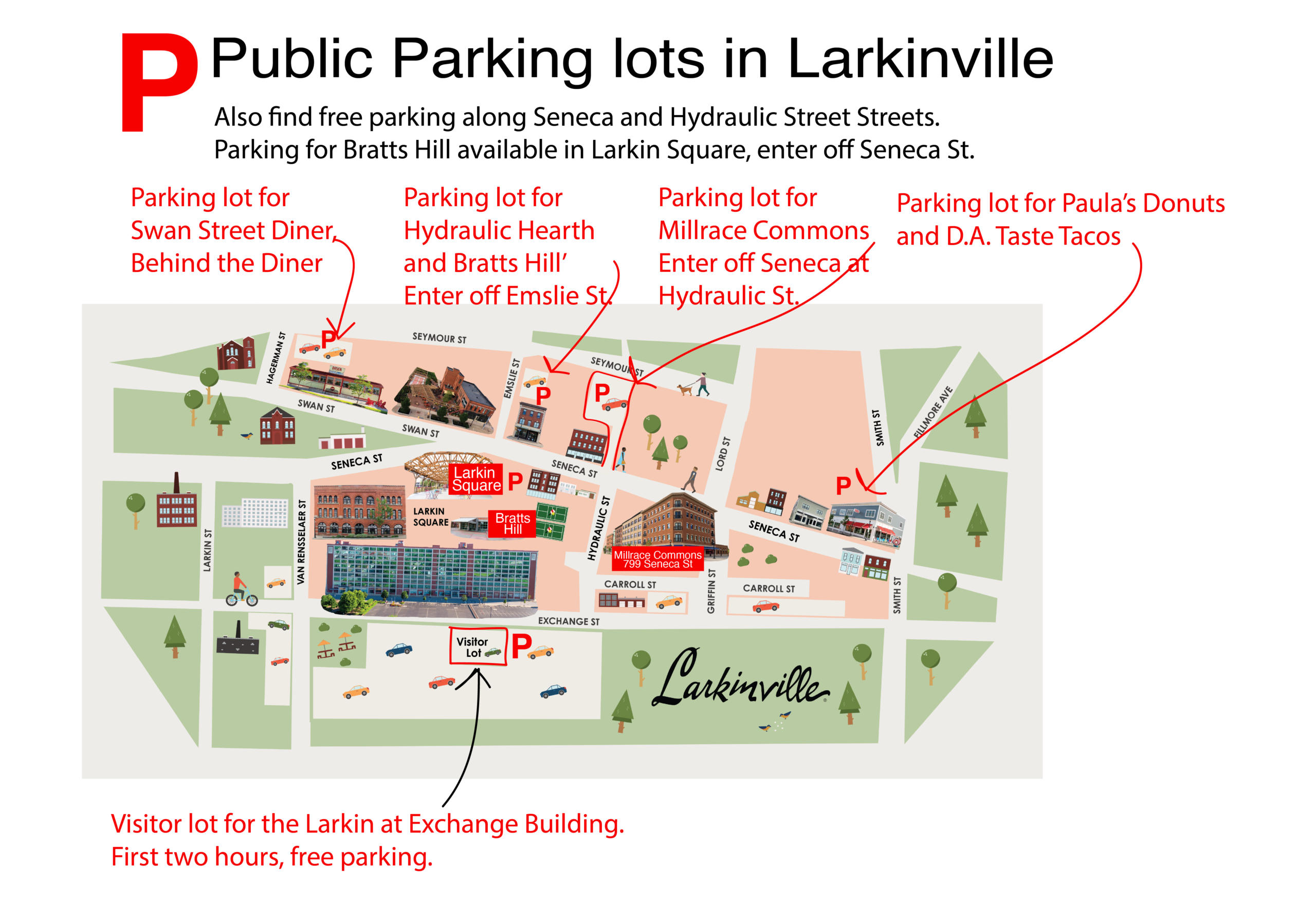 Swan Street Diner: Park behind the Diner, enter off Hagerman Street Hydraulic Hearth: Park across the street from the Hearth, enter off Emslie Street. You may also park behind the Swan Street Diner Bratts Hill: Park in Larkin Square (enter off Seneca St.) or park across the street, entering off Emslie Street. Retail and Restaurants at Millrace Commons: 799 Seneca St. Park in the lot across the street. Enter at the corner of Seneca and Hydraulic Streets. There is also street parking on Seneca, Hydraulic and Griffin Streets. Paula’s Donuts and D.A. Taste Taco: Park in the lot next to Paula’s, off Seneca Street.